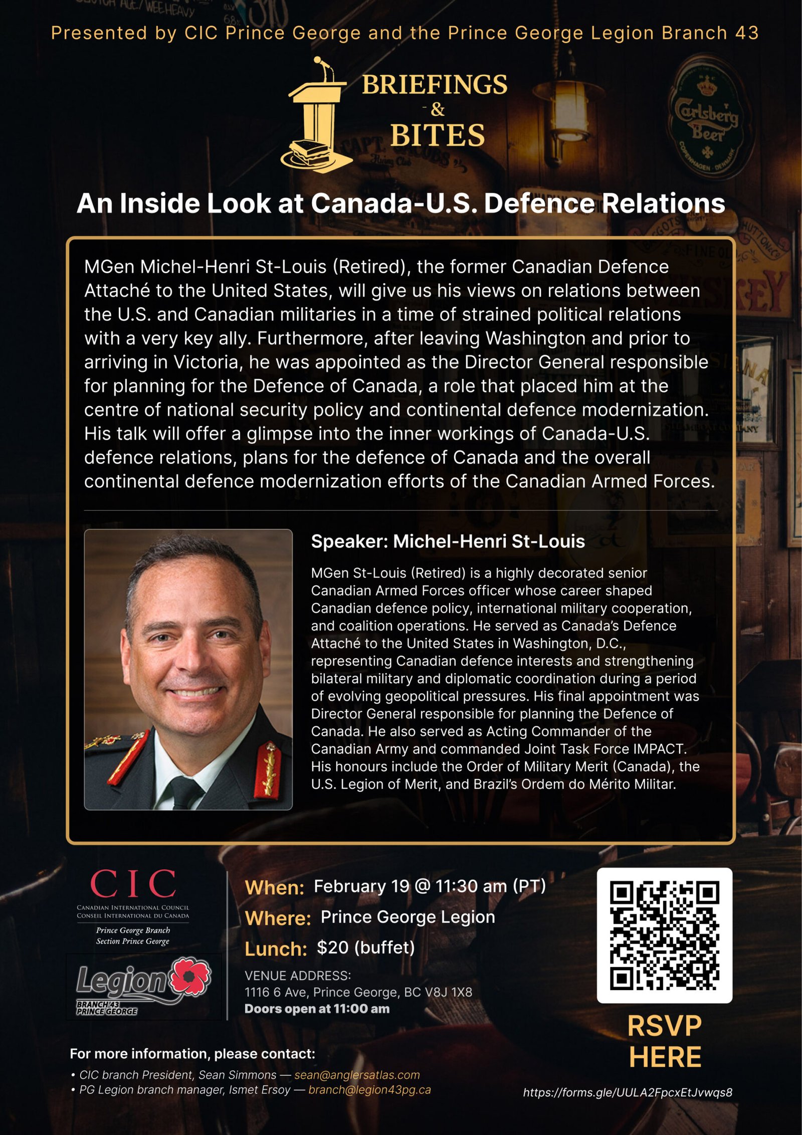 An Inside Look at Canada-U.S. Defence Relations Lunch: $20 (buffet) Doors open at 11:00 am + Add to Google Calendar + iCal / Outlook export 00 days 00 hours 00 minutes 00 seconds Date Feb 19 2026 Time 11:00 am - 2:00 pm Cost 20.00 Location Legion Prince George 1116 6 Ave, Prince George, BC V2L 3M6 Category Legion Event Share this event